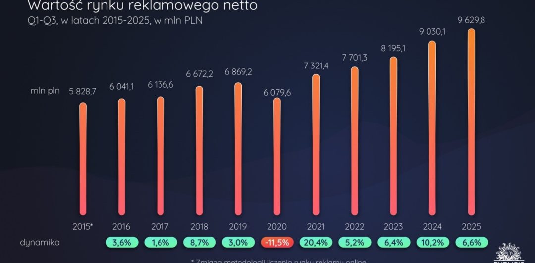 Estymowana wartość netto rynku reklamowego w Polsce po trzech kwartałach 2025 r. wyniosła ponad 9,6 mld zł, co oznacza wzrost o 6,6% rok do roku, wynika z najnowszego Raportu o Rynku Reklamy w Polsce, tworzonego przez Publicis Groupe Polska. Wykres 1. Wartość rynku reklamowego netto w latach 2015 – 2025 SEKTORY REKLAMOWE Według analityków Publicis Groupe, po trzech kwartałach 2025 r. rynek reklamy w Polsce wzrósł o 6,6% rok do roku. Aż trzynaście sektorów zwiększyło budżety reklamowe, a trzy dokonały redukcji. Największy wzrost wolumenu inwestycji wygenerował handel. Firmy…