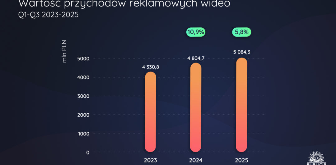 Rynek reklamy wideo, obejmujący telewizję i wideo online, wzrósł w pierwszych trzech kwartałach 2025 r. o 5,8% w porównaniu do analogicznego okresu w 2024 roku, a jego wartość wyniosła niespełna 5,1 miliarda zł, wynika z analizy Publicis Groupe Polska. Wykres 1. Wartość przychodów reklamowych wideo Q1-Q3 2023-2025 Wykres 2. Dynamika przychodów reklamowych wideo w Q1-Q3 2025 r/r W pierwszych trzech kwartałach 2025 r. wśród segmentów wideo największy udział w przychodach miała telewizja linearna (68,5%). Jednocześnie analitycy Publicis Groupe zaobserwowali dalszy spadek…