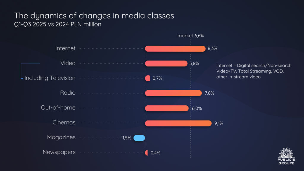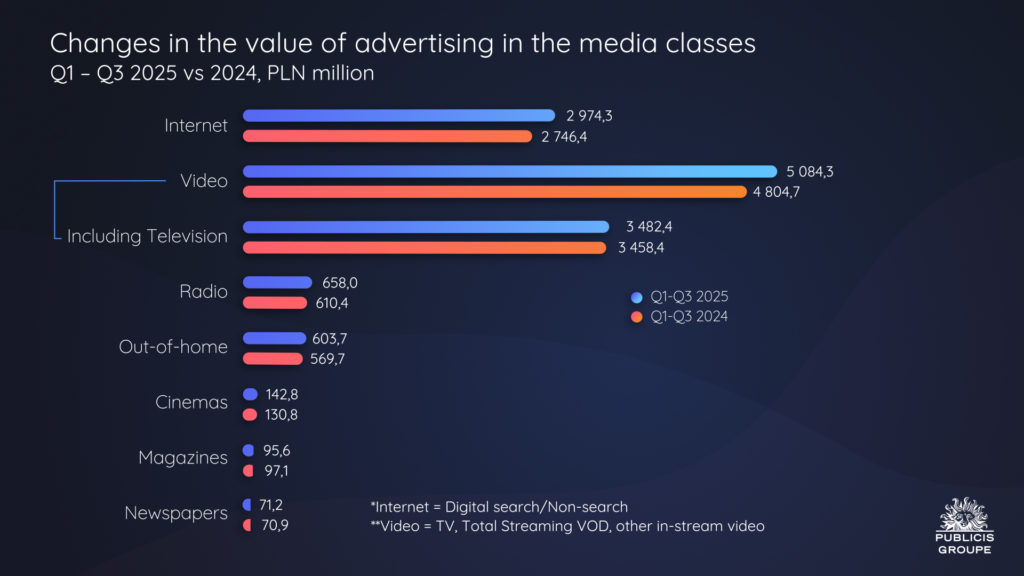 Publicis Groupe estimates show that from January to September 2025, advertising investments in video, the Internet, radio, outdoor advertising, cinema and newspapers have increased. Similarly to H1, investments in magazine advertising have declined. The fastest growth was recorded in cinema advertising, up 9.1%. The second-highest growth, also higher than the market as a whole, was recorded in internet advertising, where investments increased by 8.3%. The third medium in terms of growth was radio, with advertising investment dynamics of 7.8%. The video market grew by 5.8%, with TV-only revenue growth slowing to 0.7% and online video growth at 19.0% for the period January to September 2025. Outdoor advertising revenues grew by 6.0% after three quarters and newspapers by 0.4%. However, advertising revenues in magazines decreased by 1.5%. The volume analysis shows that video budgets increased by nearly PLN 280 million, while investment in online advertising increased by just under PLN 228 million and radio by PLN 47.6 million. In magazines, the decrease in investment amounted to close to PLN 1.5 million.