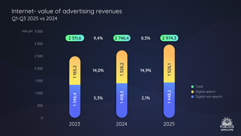 According to Publicis Groupe’s analysis, the value of Internet advertising investment in a new perspective, i.e., excluding online video (not including ad spending), amounted to PLN 3 billion from January to September 2025, up 8.3% year-on-year. The Internet’s share of the advertising market in the period was 30.9% (0.5 p.p. higher year-on-year).