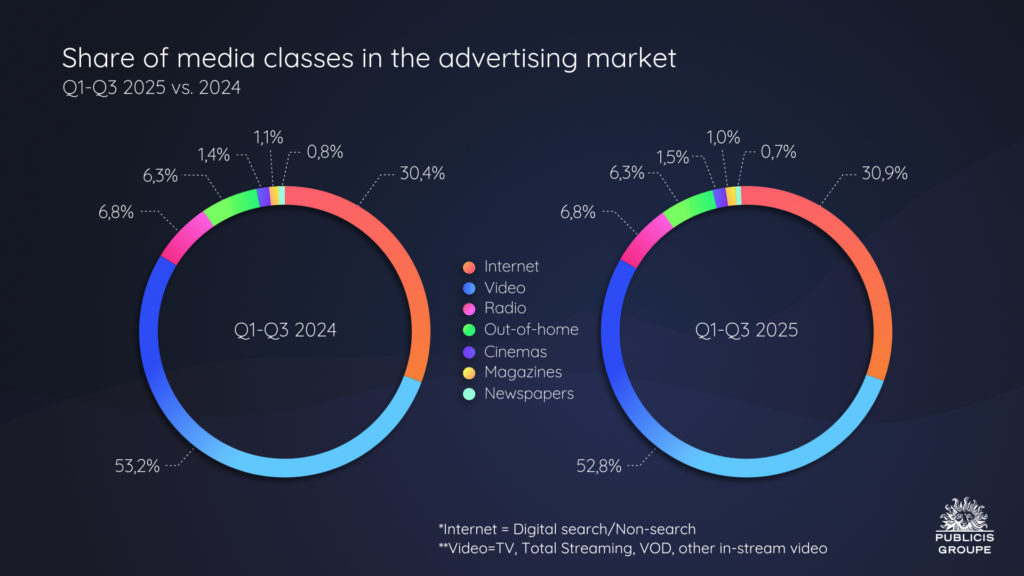 Publicis Groupe’s analysis shows that after the first three quarters of 2025 video had the largest share of the advertising market at 52.8%, compared to 53.2% in the same period last year. The value of advertising investment allocated to video was close to 5.1 billion, an increase of 5.8% year-on-year.
