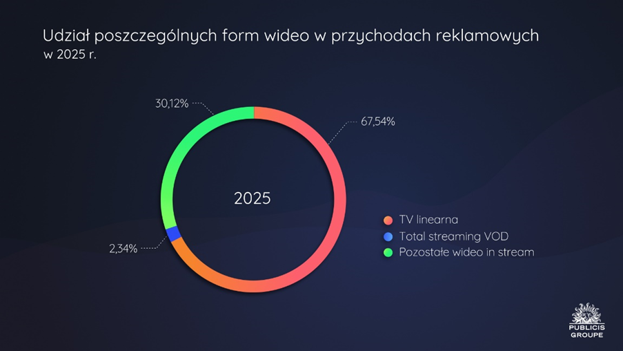 W 2025 r. wśród segmentów wideo największy udział w przychodach miała telewizja linearna (67,5%). Jednocześnie analitycy Publicis Groupe zaobserwowali dalszy spadek udziału – jeszcze w 2024 roku udział ten przekraczał 70%. Inwestycje reklamowe we wszystkie formy reklamy telewizyjnej wzrosły w okresie od stycznia do grudnia 2025 r. o 1,2% rok do roku. Również wyłączając sponsoring i lokowania, inwestycje w same spoty reklamowe zwiększyły się o 1,2%. Do słabszego wyniku rocznego przyczynił się trzeci kwartał, w którym dynamika spotów wyniosła -3,4%, zaś wszystkich form reklamy TV -2,6%. Należy zwrócić uwagę, że poza wysoką ubiegłoroczną bazą związaną z Mistrzostwami Europy w Piłce Nożnej oraz Igrzyskami Olimpijskimi w Paryżu, w trzecim kwartale brokerzy zredukowali liczbę minut reklamowych w TV (we wrześniu aż o -7,3%). Miało to związek ze znaczącym obniżeniem budżetów globalnych reklamodawców.