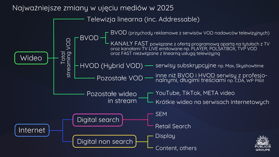 *Publicis Groupe wprowadziła łączne podejście do monitoringu rynku wideo wraz z pierwszą edycją Raportu o Rynku reklamy w 2024 r.Wprowadzone w pierwszym kwartale pojęcie ‘wideo’, obejmuje zarówno telewizję, jak i wideo online. Dotychczasowe sklasyfikowanie wideo online do kategorii internet stało się nieaktualne w dobie smart TV i CTV, gdzie granice pomiędzy tradycyjną telewizją a konsumowaniem treści wideo online zacierają się. Biorąc pod uwagę szybko zmieniającą się sytuację na rynku wideo, a także głosy z tego rynku, przeprowadzony został kolejny przegląd kategoryzacji w obrębie segmentu streamingu VOD.