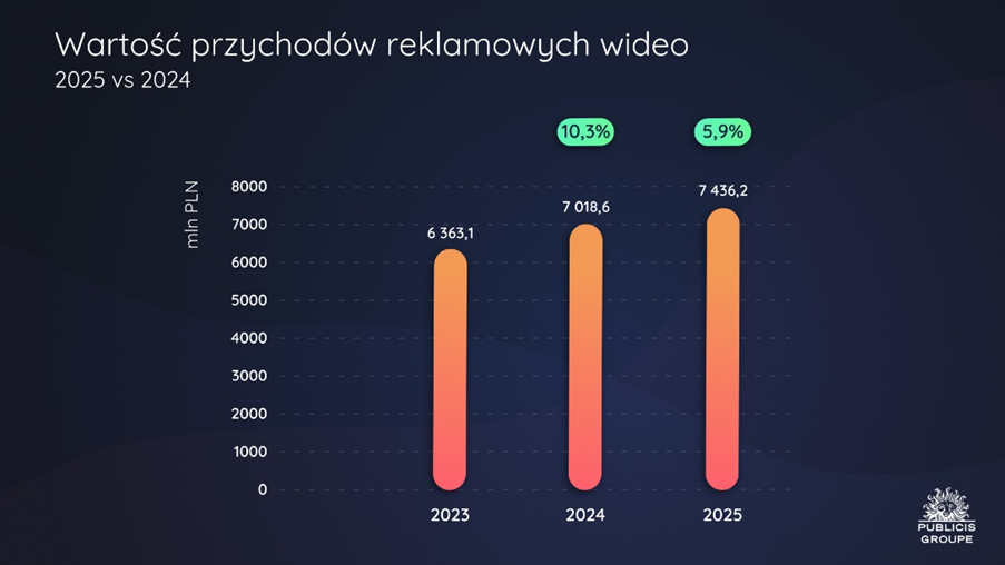 Rynek reklamy wideo, obejmujący telewizję i wideo online, wzrósł w 2025 r. o 5,9% w porównaniu do 2024 roku, a jego wartość wyniosła prawie 7,5 miliarda zł, wynika z analizy Publicis Groupe Polska.