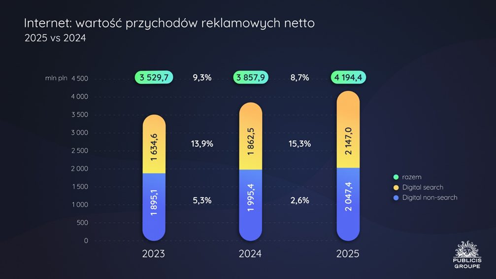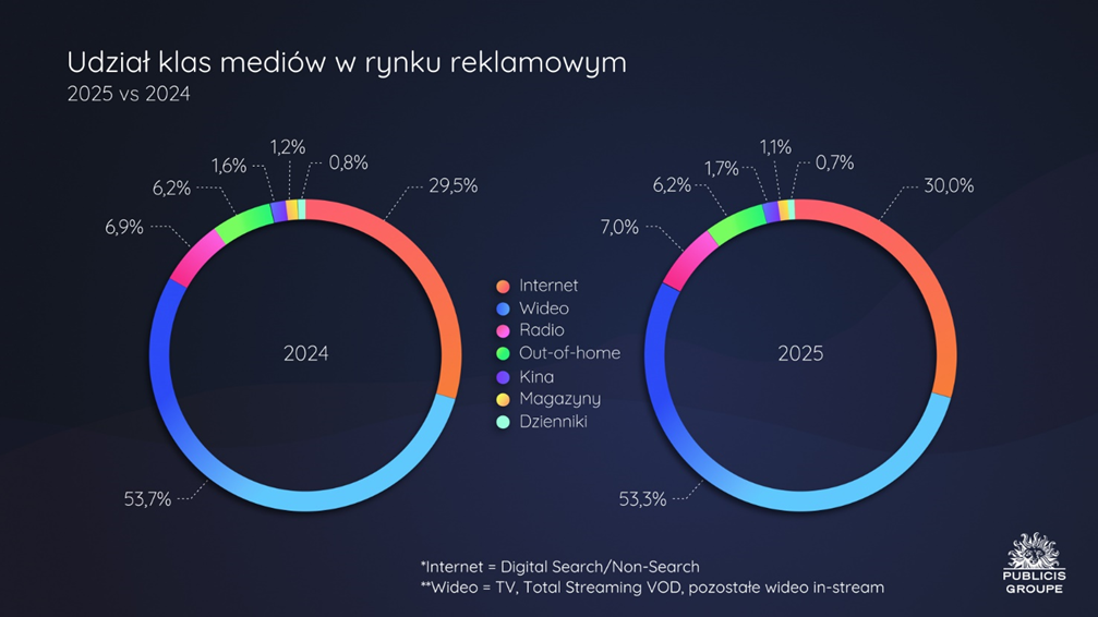 Z analiz Publicis Groupe wynika, że w 2025 r. wartość inwestycji reklamowych w internecie w nowym ujęciu, a zatem bez wideo online (nie uwzględniając wydatków na ogłoszenia), wyniosła blisko 4,2 mld zł, co oznacza wzrost o 8,7% rok do roku. Udział internetu w rynku reklamy w tym okresie wynosił 30,0% (o 0,5 p.p. więcej rok do roku).