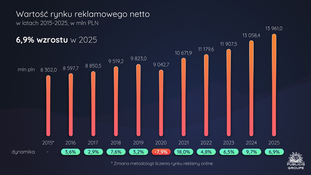 Estymowana wartość netto rynku reklamowego w Polsce w 2025 r. wyniosła blisko 14 mld zł, co oznacza wzrost o 6,9% rok do roku, wynika z najnowszego Raportu o Rynku Reklamy w Polsce, tworzonego przez Publicis Groupe Polska.