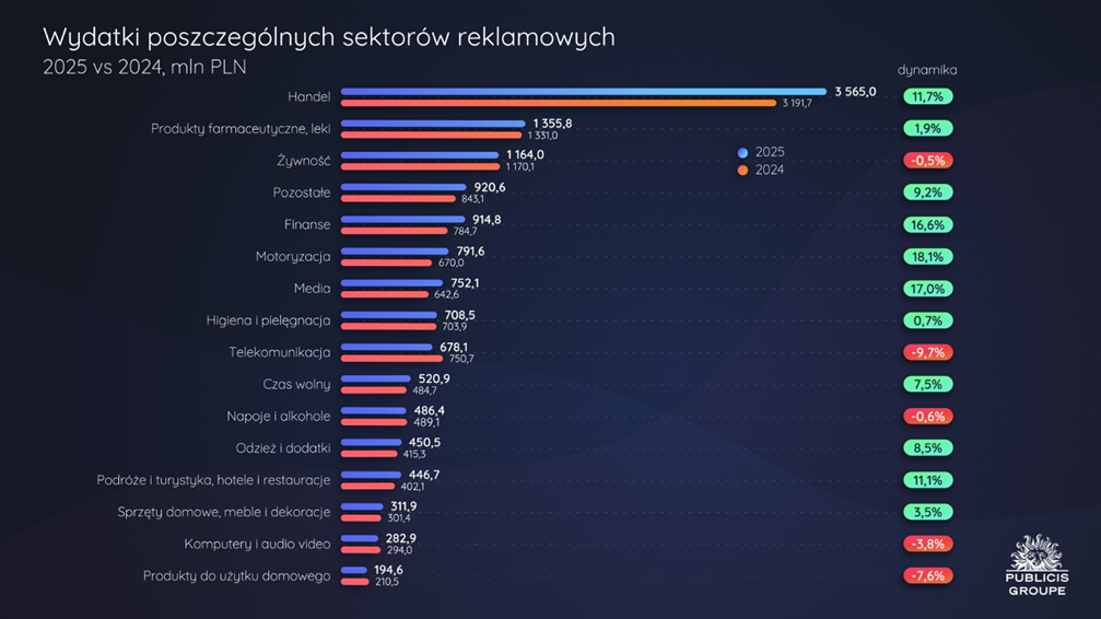 Według analityków Publicis Groupe w 2025 r., rynek reklamy w Polsce wzrósł o 6,9% rok do roku. Jedenaście sektorów zwiększyło inwestycje reklamowe, natomiast pięć dokonało redukcji budżetów.