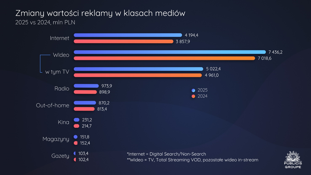 Z szacunków Publicis Groupe wynika, że w 2025 r. wzrosły inwestycje reklamowe we wszystkie media z wyjątkiem magazynów. Najwyższą dynamikę wzrostu odnotowano w przypadku reklamy w internecie – o 8,7%. Drugi w kolejności wzrost, również wyższy niż cały rynek, przypada na reklamę w radiu, gdzie inwestycje zwiększyły się o 8,3%. Trzecim medium pod względem tempa wzrostu jest kino, z dynamiką inwestycji reklamowych na poziomie 7,7%. Przychody z reklamy zewnętrznej wzrosły o 7,0%. W 2025 roku rynek wideo wzrósł o 5,9%, przy czym dynamika przychodów samej tylko telewizji spowolniła do 1,2%, zaś w przypadku wideo online – wyniosła 17,3%. Przychody reklamowe dzienników wzrosły o 1%, natomiast inwestycje w magazyny zmalały o 0,4%.